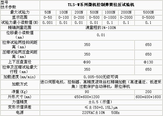 產(chǎn)品概述: TLS-WI系列微機(jī)控制拉壓彈簧試驗(yàn)機(jī)依據(jù)JB/T7796-2005《拉壓彈簧試驗(yàn)機(jī)技術(shù)條件》規(guī)定的技術(shù)要求制成。該型拉壓彈簧試驗(yàn)機(jī)主要用 于測(cè)試各種螺旋彈簧及彈性元件的強(qiáng)度,即在一定的變形量(或高度)下測(cè)試彈簧的試驗(yàn)力或在一定的試驗(yàn)力下測(cè)定彈簧的高度或變形量。 功能特點(diǎn): 本機(jī)主要適用于各種彈簧的強(qiáng)度試驗(yàn)、力學(xué)性能及工序能力分析。 本機(jī)軟件包有速度控制、參數(shù)輸入、數(shù)據(jù)處理、結(jié)果觀察、圖表顯示、圖表打印、數(shù)據(jù)保存等功能模塊組成。 試驗(yàn)方式多樣化,可以設(shè)置彈簧的試驗(yàn)力,彈簧拉力試驗(yàn)機(jī)價(jià)格,檢測(cè)彈簧的剩余高度或變形量;也可以設(shè)置彈簧的剩余高度或變形量,檢測(cè)試驗(yàn)力等功能。 多點(diǎn)自動(dòng)變速采集數(shù)據(jù),彈簧機(jī)廠,并自動(dòng)返回到初始位置,整個(gè)試驗(yàn)過(guò)程自動(dòng)化。 過(guò)載自動(dòng)返回,濟(jì)南彈簧試驗(yàn)機(jī)代理,以保護(hù)傳感器不受損壞。 具有強(qiáng)大的數(shù)據(jù)處理及數(shù)據(jù)統(tǒng)計(jì)功能,繪制剛度曲線、計(jì)算彈簧的分段剛度,可以進(jìn)行數(shù)據(jù)統(tǒng)計(jì),繪制正態(tài)分布圖、計(jì)算工序能力指數(shù)。采用數(shù)控電機(jī)調(diào)速系 統(tǒng)或進(jìn)口交流伺服電機(jī)及調(diào)速器和精密滾珠絲杠副組成傳動(dòng)系統(tǒng),與高精度負(fù)荷傳感器、位移傳感器及數(shù)字式數(shù)據(jù)采集卡、PC組成測(cè)控系統(tǒng),實(shí)現(xiàn)了穩(wěn)定可靠運(yùn)行 及精確測(cè)量。 技術(shù)參數(shù): ![]() ![]()
