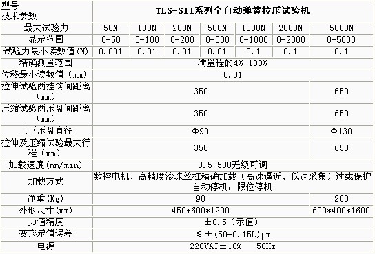 產(chǎn)品概述: TLS-SII系列全自動數(shù)顯式拉壓試驗機是適用于拉壓試驗的新型試驗設(shè)備。試驗機主機的設(shè)計具有外形美觀、操作方便、性能穩(wěn)定可靠的特點。試驗機 采用數(shù)控電機及先進的單片機控制技術(shù)加載及控制,能實現(xiàn)雙速預(yù)置。實現(xiàn)了高速逼近,低速采集。提高了測試精度,保證了試驗效率。 功能特點: 自動變速檢測5個測試點,并自動返回到試驗初始位置 LED顯示,壓縮彈簧試驗機,人機對話直觀明了便于操作 可以選擇多種測試方法,順次自動完成一批工件的測試,扭力彈簧試驗機,可查看已測數(shù)據(jù) 傳感器引起的變形量可以補償,既傳感器和整機剛度引起的變形不影響位移精度。 可實現(xiàn)試驗力、試驗速度、位移等多種控制方式,單數(shù)顯彈簧試驗機,具有以下功能: 設(shè)定變形量F,檢測彈簧的試驗力P; 設(shè)定彈簧的剩余高度H,檢測彈簧的試驗力P; 彈簧變形的檢測已工作壓盤接觸彈簧為準(zhǔn),此時試驗力有反應(yīng),試驗力(初始力)的大小任意設(shè)定。 技術(shù)參數(shù):