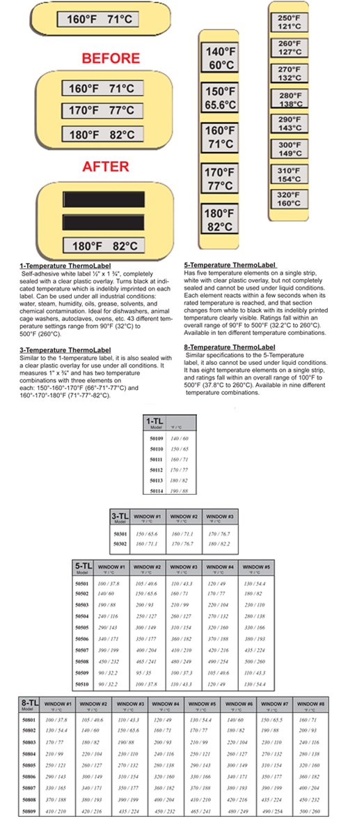 DeltaTrak提供滿足你各種需要的標簽:WarmMark溫度標簽、高溫熱標簽和TempDot時間溫度指示標簽顯示溫度變 化超過預設的時間。FreezeCheck和ColdMark溫度標簽用于顯示運輸溫度低于0℃。商業(yè)洗碗機使用的TempDot高溫熱標簽可顯示最終沖 洗水溫是否達到71℃(HACCP體系所要求的溫度)。 高溫ThermoLabel標簽,,型號50101-50809,,準確價廉,,一次標簽提供溫度變化的永久記錄。有一、三、五、八步溫度變化,,可從32℃測至260℃。