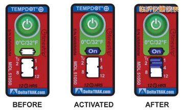 TempDot™Plus標(biāo)簽應(yīng)存儲在室溫下,并必須在反應(yīng)溫度閾值以上被激活。激活是通過用手指推壓。"On"字出現(xiàn)在第一個窗口中顯示激活。之后5分 鐘內(nèi),,在反應(yīng)溫度或低于反應(yīng)溫度的情況下將標(biāo)簽貼到產(chǎn)品上。藍色染料熔化并以控制的速率遷移,經(jīng)過白色大窗口。這表示暴露在溫度閾值以上的累計時間。當(dāng)溫 度低于閾值時,該染料固化并停止移動。如果溫度超過閾值,,TempDot®Plus標(biāo)簽提供即時的視覺跡象。