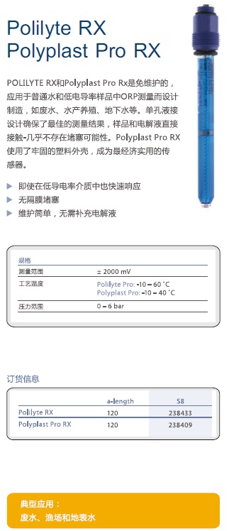 POLILYTE RX和Polyplast Pro RX是免維護(hù)的,,應(yīng)用于普通水和低電導(dǎo)率樣品中ORP測量而設(shè)計(jì)制造,,如廢水、水產(chǎn)養(yǎng)殖、地下水等。單孔液接設(shè)計(jì)確保了最佳的測量結(jié)果,,樣品和電解液直接接觸-幾乎不存在堵塞可能性。Polyplast Pro RX使用了牢固的塑料外殼,,成為最經(jīng)濟(jì)實(shí)用的傳感器。