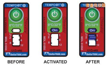 TempDot™Plus標(biāo)簽應(yīng)存儲(chǔ)在室溫下,并必須在反應(yīng)溫度閾值以上被激活。激活是通過用手指推壓。"On"字出現(xiàn)在第一個(gè)窗口中顯示激活。之后5分 鐘內(nèi),,在反應(yīng)溫度或低于反應(yīng)溫度的情況下將標(biāo)簽貼到產(chǎn)品上。藍(lán)色染料熔化并以控制的速率遷移,,經(jīng)過白色大窗口。這表示暴露在溫度閾值以上的累計(jì)時(shí)間。當(dāng)溫 度低于閾值時(shí),該染料固化并停止移動(dòng)。如果溫度超過閾值,,TempDot®Plus標(biāo)簽提供即時(shí)的視覺跡象。