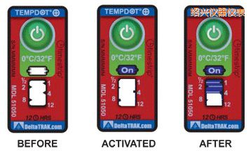 TempDot™Plus標(biāo)簽應(yīng)存儲(chǔ)在室溫下,,并必須在反應(yīng)溫度閾值以上被激活。激活是通過用手指推壓。"On"字出現(xiàn)在第一個(gè)窗口中顯示激活。之后5分 鐘內(nèi),,在反應(yīng)溫度或低于反應(yīng)溫度的情況下將標(biāo)簽貼到產(chǎn)品上。藍(lán)色染料熔化并以控制的速率遷移,經(jīng)過白色大窗口。這表示暴露在溫度閾值以上的累計(jì)時(shí)間。當(dāng)溫 度低于閾值時(shí),該染料固化并停止移動(dòng)。如果溫度超過閾值,,TempDot®Plus標(biāo)簽提供即時(shí)的視覺跡象。