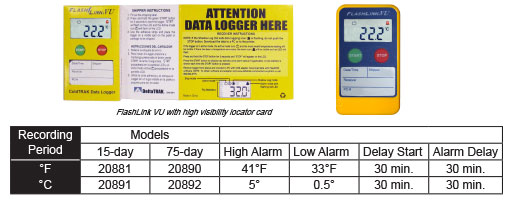 FlashLink VU 果蔬記錄儀 是專(zhuān)門(mén)設(shè)計(jì)用來(lái)記錄農(nóng)產(chǎn)品的貯存和運(yùn)輸溫度。記錄儀具有高/低報(bào)警設(shè)置預(yù)編程(41°F/33°F)?蛻(hù)運(yùn)輸農(nóng)產(chǎn)品可以使用這款一次性數(shù)據(jù)記錄儀。 它有一個(gè)大而易閱讀的液晶顯示屏,能夠提供即時(shí)的溫度信息和統(tǒng)計(jì)數(shù)據(jù),溫度調(diào)節(jié)記錄儀,包括行程中的溫度上下極限、溫度超標(biāo)的累積時(shí)間、最高溫度、最低溫度和平均溫度。即 使是使用者不啟動(dòng)數(shù)據(jù)記錄儀,其專(zhuān)利的影子記錄功能也能保證歷史溫度數(shù)據(jù)的獲取。 應(yīng)用:記錄溫度敏感的產(chǎn)品儲(chǔ)存和運(yùn)輸條件的理想設(shè)備。