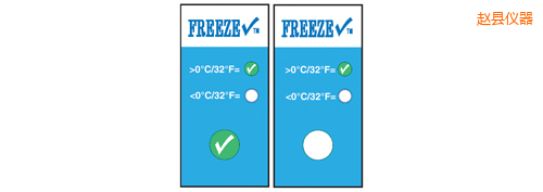 TempDot FreezeCheck標(biāo)簽,型號(hào)54000,用來(lái)表示溫度低于0°C。如果溫度低于0°C,標(biāo)簽不可逆轉(zhuǎn)地發(fā)生變化,變成白色,,勾形標(biāo)記消失。 冷凍檢查標(biāo)簽用來(lái)指示溫度低于0°C. 當(dāng)溫度下降到低于臨界點(diǎn), 指示劑不可逆轉(zhuǎn)的改變從清晰到白色并且綠色合格標(biāo)志不再顯示。