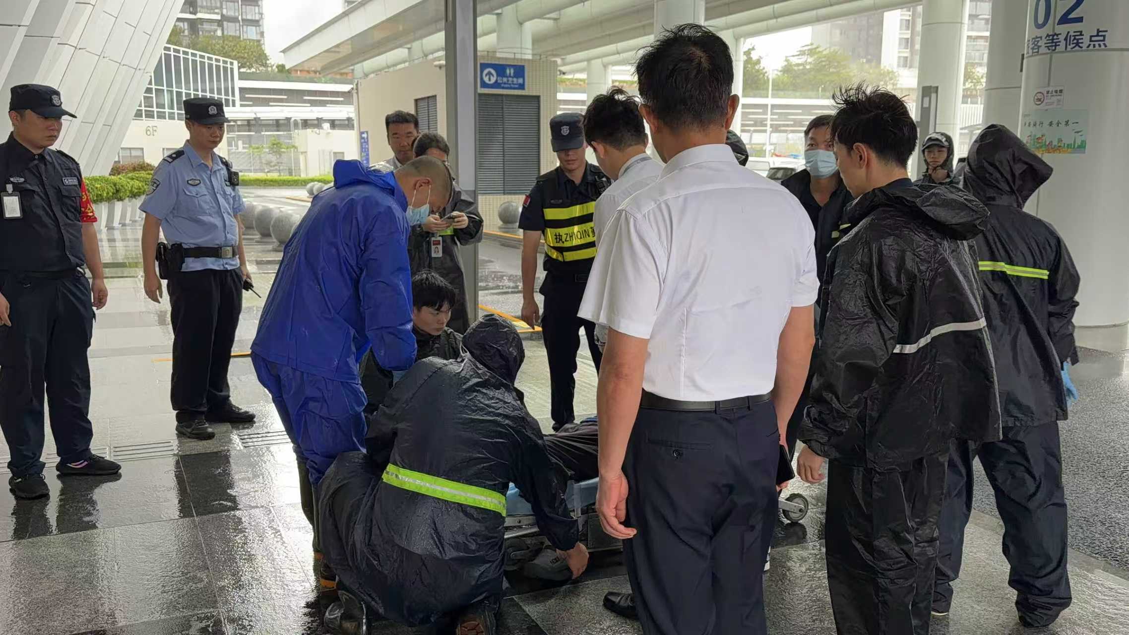 24日10時,特發(fā)服務下屬口岸公司在蓮塘口岸二樓入境大廳接到緊急求助,兩名旅客中一人因腰部摔傷,出現(xiàn)嘔吐、呼吸困難癥狀且需坐輪椅就醫(yī)。面對“五停”期間的交通困境,現(xiàn)場保安隊員第一時間呼叫增援并撥打120,3分鐘內(nèi)值班崗、醫(yī)療協(xié)助崗等多崗位人員迅速到位,一邊穩(wěn)定旅客情緒、詳細了解傷情以精準對接急救中心;等待期間為通關人員主動提供雨衣、飲用水和食品,在臺風呼嘯的窗外,用高效協(xié)作與暖心服務搭建起生命通道。