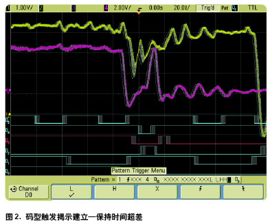 一旦我們發(fā)現(xiàn)電路存在非預(yù)期的行為就可開始進一步調(diào)試我們的系統(tǒng)。使用混合信號示波器(MSO)的邏輯通道就能設(shè)置跨多個模擬和數(shù)字通道的組合邏輯碼型觸發(fā)條件。它揭示由于時鐘抖動我們的系統(tǒng)偶爾出現(xiàn)對建立 保持時間指標的超差如圖2 所示。