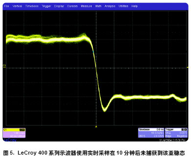 圖5是嘗試用LeCroy WaveSurfer400 系列示波器默認的實時采集模式捕獲同樣的異常事件。由于在此時基設(shè)置下示波器的實時更新率僅165 波形/ 秒把探頭放在測試點上10 秒后我們未捕獲到任何異常。為使用LeCroy WaveSurfer示波器捕獲該毛刺需要在該測試點上探測將近5 分鐘。