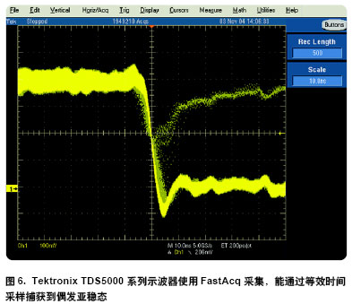 在使用四種不同示波器實時采集模式的上述例子中只有采用MegaZoom技術(shù)的 Agilent MSO6000系列示波器能可靠捕獲偶發(fā)的亞穩(wěn)態(tài)(圖1)。但使用其它“專門”采集模式時情況又會如何呢?如前所述Tektronix TDS5000 系列示波器宣稱具有高于100,000 波形/ 秒的標志性波形更新率指標。該更新率對捕獲偶發(fā)事件(50,000 周期中的1個)應(yīng)是足夠的。使用Tektronix 的FastAcq采集模式TDS5000系列示波器確能以超過100,000/ 秒的采集捕獲波形如圖6所示。但為使用這一工作模式您必須作出多方面的權(quán)衡。該FastAcq 模式: