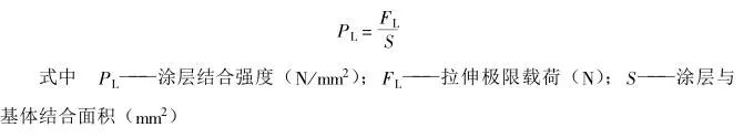涂層拉伸強度是涂層承受法線方向(垂直于涂層表面)拉伸應力的極限能力,這是評定涂層結合力的最重要指標。試驗中,利用試驗工具或設備使試樣承受垂直于涂層表面的拉伸力,直至試樣被拉開,即涂層剝離,記下破壞時的載荷,以試樣的斷面積除此載荷值,即可計算出涂層的拉伸強度。如下式: