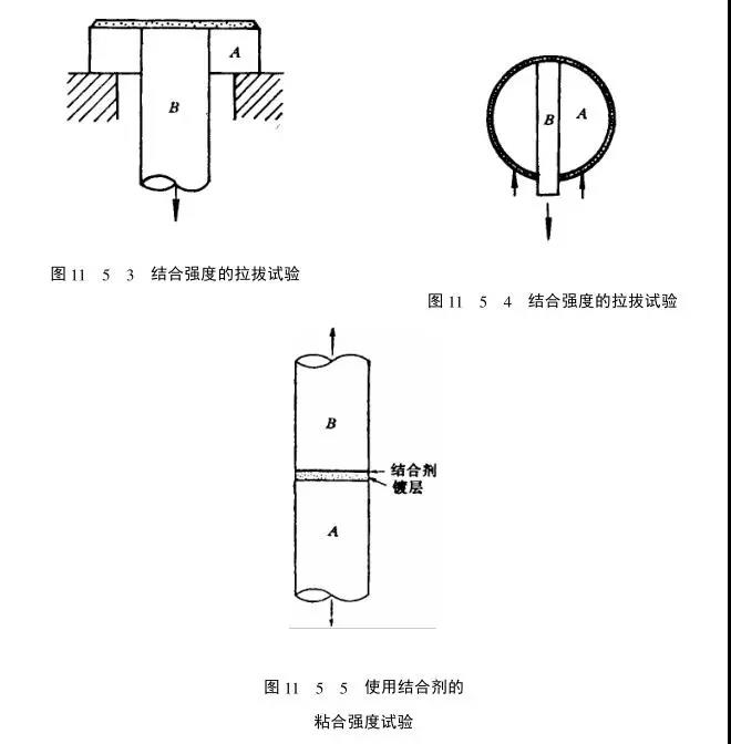 此外,對于軸類等圓柱形噴涂件,可如圖11_5_4所示,在圓柱形試件A上開孔,使活塞g通過,并使活塞的上表面曲率與圓柱試件的曲率相同,形成同一曲面后進行噴涂,然后從下面支撐住圓柱試件,垂直向下拉拔活塞B,直至活塞上表面涂層被破壞,測出受力,再根據(jù)活塞斷面積,即可計算出涂層的結合強度。