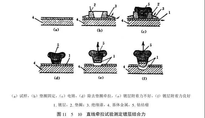 直線章拉試驗可直接在鍍件上進行。首先在試件鍍層表面,用一非導體墊國固定在被測部位上,并在墊國以外的鍍層表面加以絕緣層,然后在墊國以內(nèi)的鍍層上電鑄鈷或其它金屬,經(jīng)一定時間,在該鍍層上沿墊國內(nèi)壁形成一個金屬結瘤,電鑄結束后取下墊國,除去絕緣層,將鑄有金屬結瘤的試件置于專用的張力測試機上,以機械力將般層牽拉至斷裂見圖11_5_10。根據(jù)般層剝離時用力的大小及般層結合面積可計算出般層的結合強度。