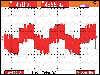 50 Hz馬達驅(qū)動輸出電壓的脈寬調(diào)制信號的細節(jié)。1000V,50 微秒的脈沖即導致某些測試設備的不穩(wěn)定。